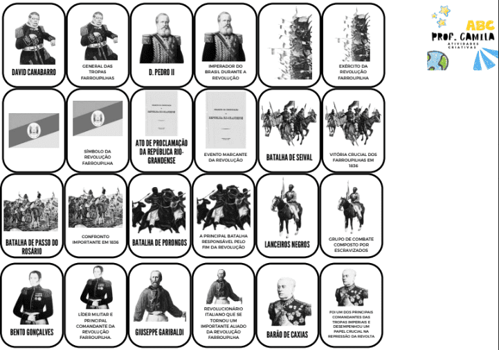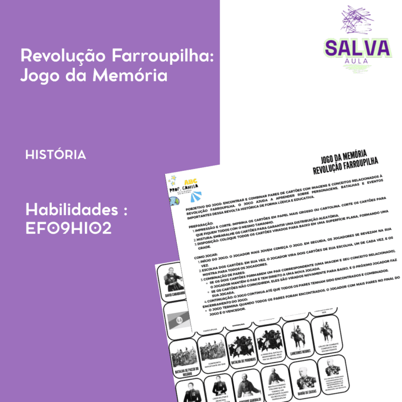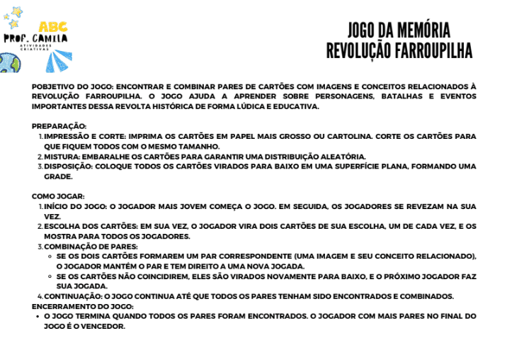 Uma proposta lúdica para revisar conceitos e personagens ligados à Revolução Farroupilha. O jogo da memória traz pares com imagens e descrições sobre eventos, batalhas e líderes históricos, promovendo o aprendizado de forma ativa e divertida. Ideal para turmas do 9º ano e para momentos de revisão.