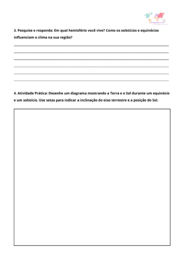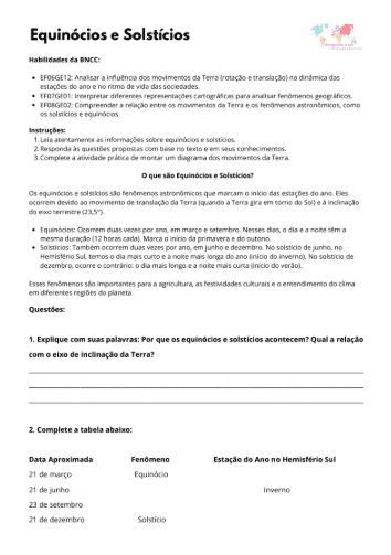 Esta atividade combina leitura, interpretação de texto e construção de diagramas para explicar os equinócios e solstícios. Os alunos relacionam os fenômenos astronômicos com as estações do ano e os ritmos da sociedade. A proposta é reflexiva e pode ser usada em duplas ou grupos.