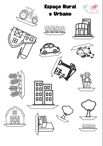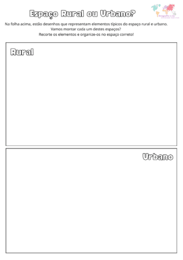 Atividade comparativa com recorte, colagem e preenchimento de quadro sobre as características do espaço rural e urbano. Os alunos analisam moradia, transporte, lazer, infraestrutura e serviços em cada espaço. Ideal para turmas dos anos finais do Fundamental, promovendo a análise crítica e visual.