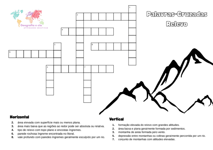 Um conjunto completo de palavras cruzadas temáticas sobre relevo, hidrografia, cartografia, clima, meio ambiente, sociedade, rochas, fusos horários e muito mais. Uma forma divertida e eficaz de revisar conteúdos geográficos do 6º ao 8º ano. Pronto para imprimir!