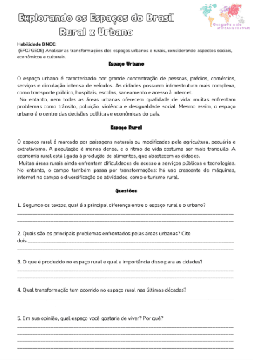 Com leitura, interpretação e questões reflexivas, esta atividade compara os espaços rural e urbano, seus desafios, transformações e funções. Promove a análise crítica e é ideal para o 7º ano. Inclui gabarito.