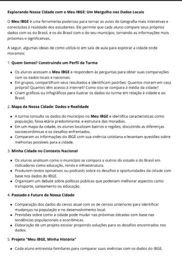 Conjunto de atividades que utiliza a ferramenta “Meu IBGE” para construir um perfil da turma, comparar dados municipais e nacionais, criar autorretratos e infográficos. Estimula cidadania, análise crítica e leitura de dados