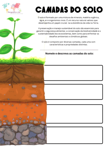 Esta atividade convida os alunos a explorarem os diferentes horizontes do solo de forma visual e interativa. Indicada para o 6º ano do Ensino Fundamental, a proposta estimula a identificação e descrição das camadas do solo, conectando o conteúdo à importância da preservação ambiental e ao papel vital do solo na vida terrestre. A atividade é pronta para imprimir, apresenta layout limpo e é ideal para uso em aulas de Ciências ou Geografia com foco em práticas sustentáveis.