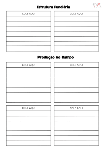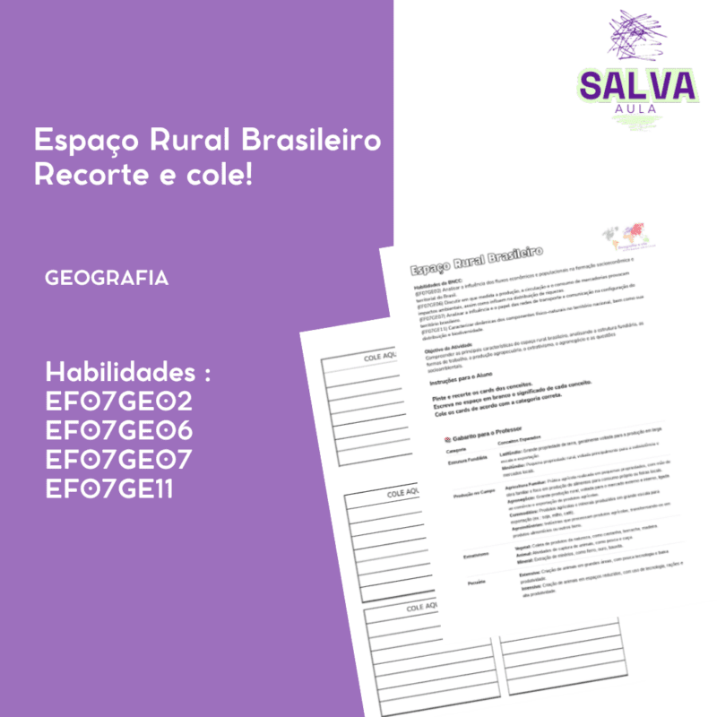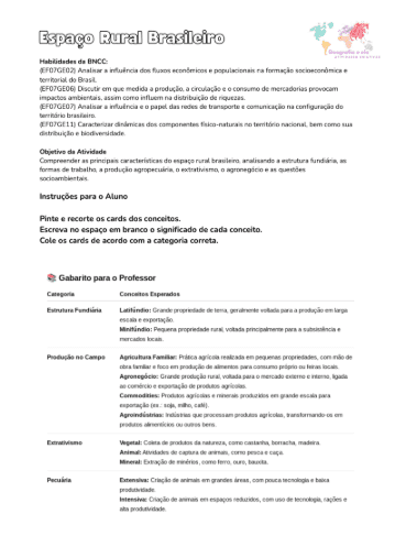 Por meio de cards recortáveis, os alunos identificam e classificam conceitos ligados ao espaço rural brasileiro, como agropecuária, extrativismo e estrutura fundiária. Uma atividade visual, lúdica e reflexiva para o 7º ano, que favorece o aprendizado ativo e a discussão sobre as dinâmicas e desigualdades no campo.