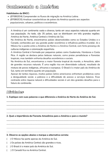 Com textos informativos e atividades variadas, os alunos exploram as diferenças entre as Américas do Norte, Central e do Sul. A proposta envolve questões objetivas, ligue-colunas, verdadeiro ou falso e até uma redação curta, promovendo leitura crítica e interdisciplinaridade no 8º ano.