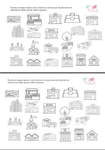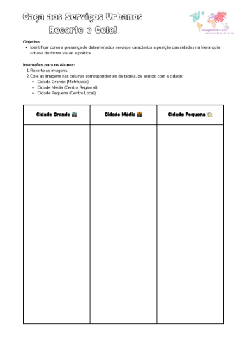 Nesta atividade prática, os alunos recortam e colam imagens em uma tabela, classificando serviços urbanos de acordo com o porte da cidade. Ideal para o 7º ano, é uma introdução visual e divertida ao conceito de hierarquia urbana, estimulando a comparação entre realidades locais.
