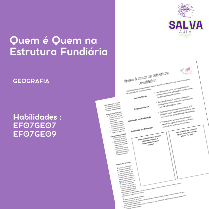 Os alunos associam definições de tipos de propriedade rural e refletem sobre os impactos sociais do latifúndio. Com questões discursivas sobre reforma agrária e desigualdade no campo, é uma atividade potente para desenvolver pensamento crítico e justiça social no 7º ano.