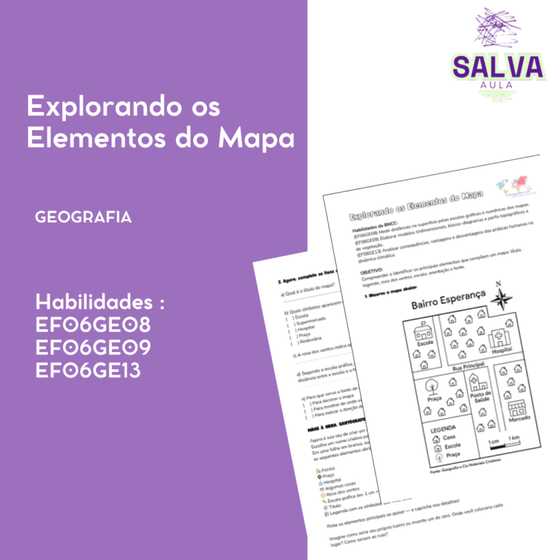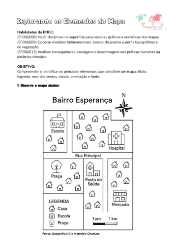 Com base em exemplos visuais e práticos, os alunos do 6º ano exploram os principais elementos do mapa, como rosa dos ventos, escala e legenda.