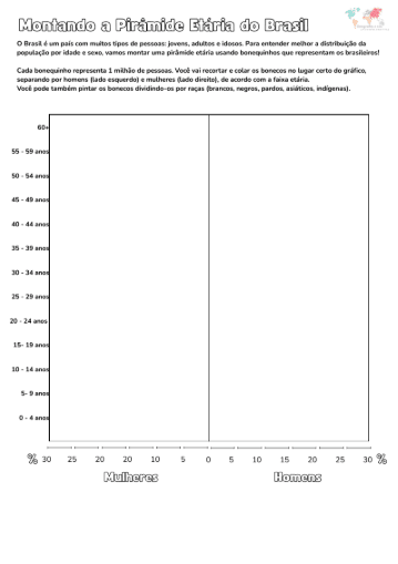 Os alunos do 7º ano constroem e analisam uma pirâmide etária com base em dados populacionais. A atividade desenvolve habilidades de leitura e interpretação de gráficos, promovendo discussões sobre envelhecimento, juventude e políticas públicas. Pronta para imprimir e visual.