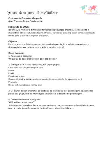 Indicada para o 7º ano, essa atividade leva os alunos a refletirem sobre a diversidade étnico-cultural brasileira por meio de textos e atividades visuais. É ideal para trabalhar identidade, cultura e pertencimento. Versão acessível, pronta para imprimir.