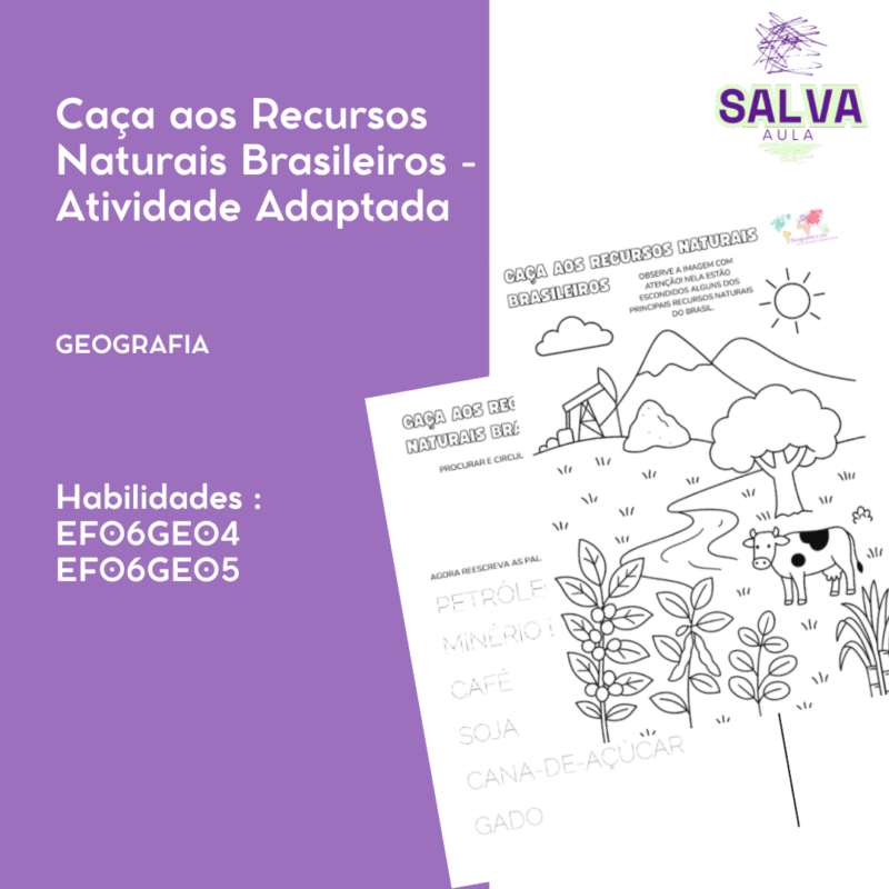 Atividade lúdica onde os alunos localizam recursos naturais escondidos em uma ilustração. Depois, reescrevem os nomes e reforçam o reconhecimento dos principais elementos da economia e natureza brasileira. Indicada para anos iniciais e AEE