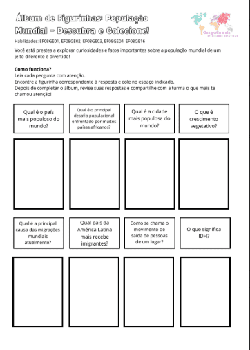 O Álbum de Figurinhas: População Mundial – Descubra e Colecione! convida os estudantes a responder perguntas e colar as figurinhas correspondentes no espaço correto, transformando o conteúdo em um desafio investigativo.
