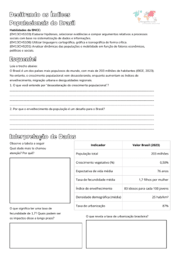 Os alunos analisam dados atualizados da população brasileira, como taxa de fecundidade, envelhecimento e urbanização. A atividade propõe debates, interpretação de gráficos e criação de um folder informativo. Ideal para o Ensino Médio