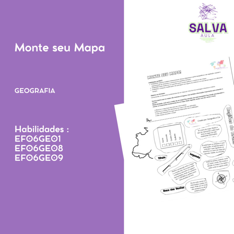Atividade prática de montagem dos cinco elementos de um mapa (título, legenda, escala, rosa dos ventos e fonte). Os alunos recortam e colam os elementos no local correto, estimulando o pensamento cartográfico desde o início do ensino fundamental