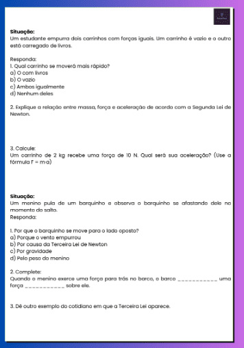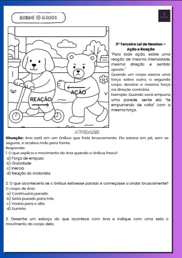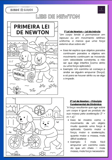 Esta atividade traz as três Leis de Newton ilustradas com apoio visual no estilo Bobbie Goods, tornando o conteúdo mais atrativo para os alunos. Com situações do cotidiano, perguntas objetivas, dissertativas e um exercício de cálculo usando a fórmula F=m⋅a, os estudantes aplicam os conceitos de inércia, força e ação-reação de forma contextualizada. Ideal para turmas do Ensino Médio e adaptável ao AEE, a proposta é lúdica, acessível e pronta para imprimir. Acompanha gabarito completo.