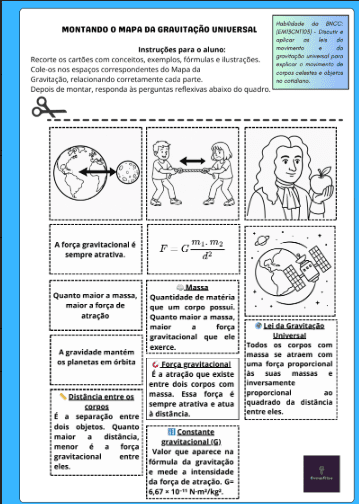 Esta atividade propõe a montagem de um mapa visual sobre a Lei da Gravitação Universal, com cartões de recorte contendo definições, fórmulas, variáveis, aplicações e ilustrações. Os alunos devem organizar as informações e responder a perguntas reflexivas que aprofundam a compreensão sobre massa, distância e força gravitacional. Ideal para o Ensino Médio, estimula o raciocínio científico, a organização conceitual e a contextualização com fenômenos do cotidiano e do universo. Pronta para imprimir, com gabarito incluso.
