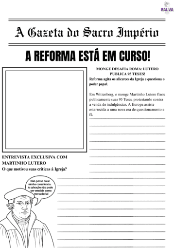 Nesta atividade, os alunos assumem o papel de jornalistas do século XVI e criam sua própria edição de jornal sobre os acontecimentos que abalaram a Europa — como se estivessem noticiando as 95 Teses de Martinho Lutero e os impactos da Reforma.