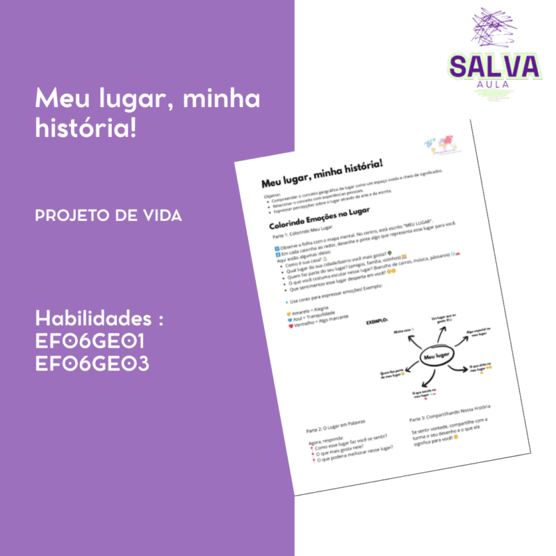 Um mapa mental ilustrado e colorido sobre o lugar vivido. Os alunos desenham e escrevem sobre casa, som, sentimentos e memórias. Estimula a construção de identidade geográfica de maneira inclusiva e reflexiva. Ideal para turmas do 6º ao 8º ano