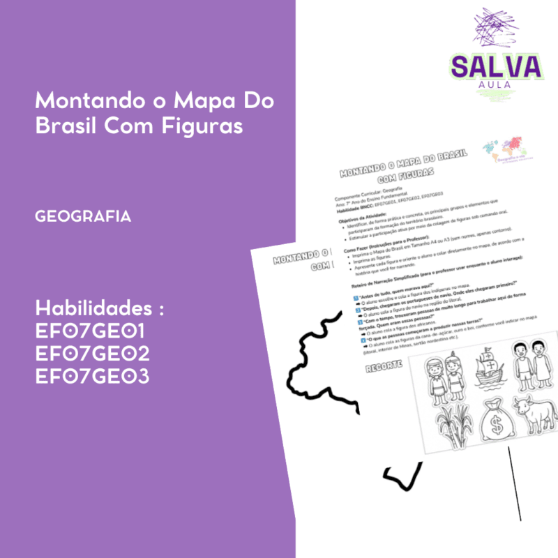 Atividade interativa para montar o mapa do Brasil a partir de colagem de figuras que representam momentos históricos (indígenas, colonização, atividades econômicas). Ideal para turmas do 7º ano. Acompanha roteiro de narração e promove aprendizagem sensível e visual