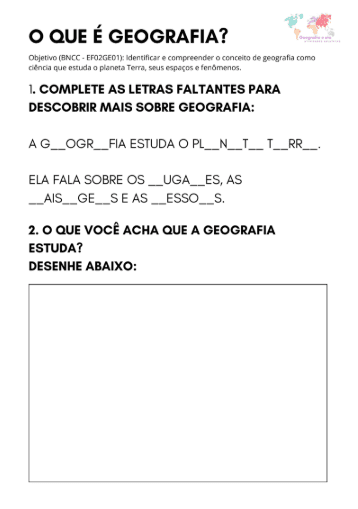 Este material adaptado é ideal para alunos dos anos iniciais do Ensino Fundamental, especialmente em contextos de AEE. Com atividades de completar palavras, ligar imagens, pintar e desenhar, os estudantes exploram de forma lúdica e acessível os conceitos básicos de geografia: o que é geografia, o que é lugar, paisagens naturais e humanizadas, e espaço geográfico. Com visual atrativo, linguagem simplificada e foco inclusivo, esta atividade é perfeita para introduzir os primeiros conceitos da disciplina. Pronta para imprimir!