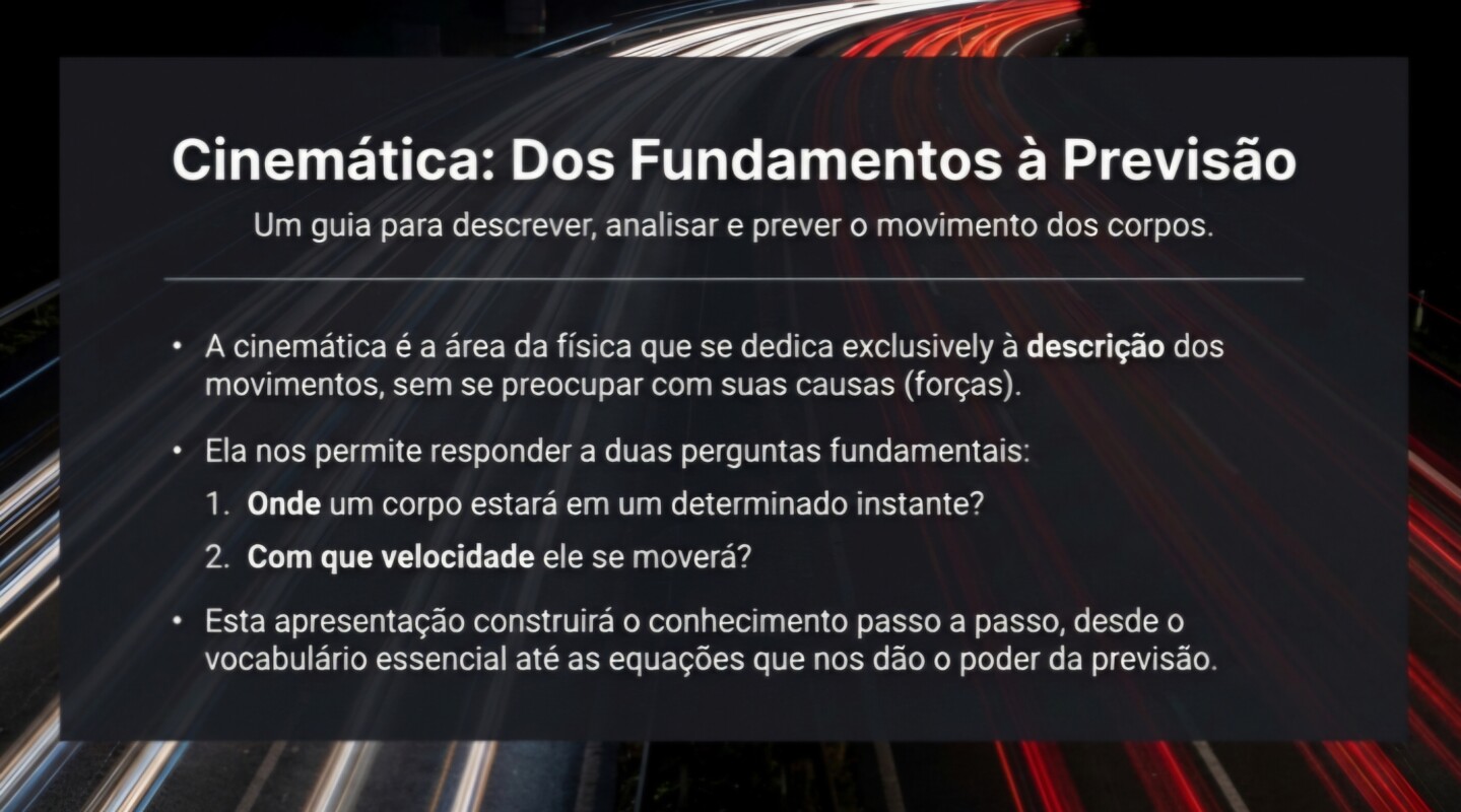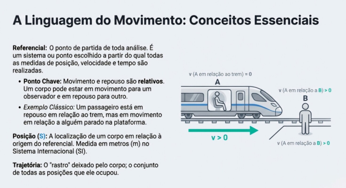 Ao longo dos slides, os estudantes constroem uma compreensão sólida dos conceitos fundamentais do estudo do movimento, partindo da observação do cotidiano até a interpretação matemática dos fenômenos físicos.